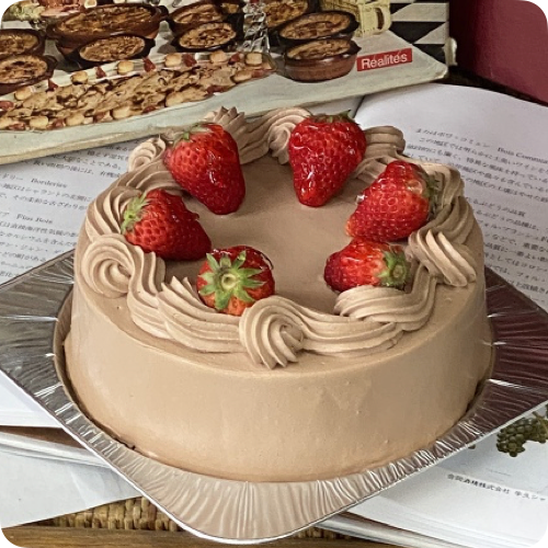 シックなブラウンのクリームと鮮やかな苺の赤が映える上品なデザインで、お誕生日や特別な日のお祝いにもぴったりです。